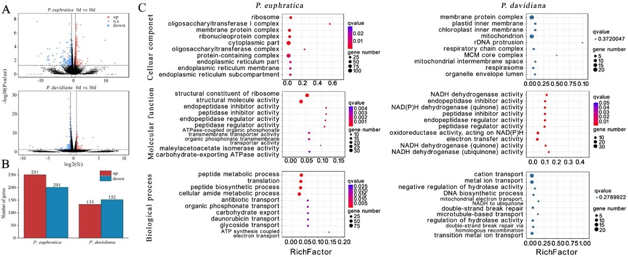 胡杨(Populus euphratica)和山杨(Populus davidiana)种子老化过程中,差异基因比较及GO富集分析。